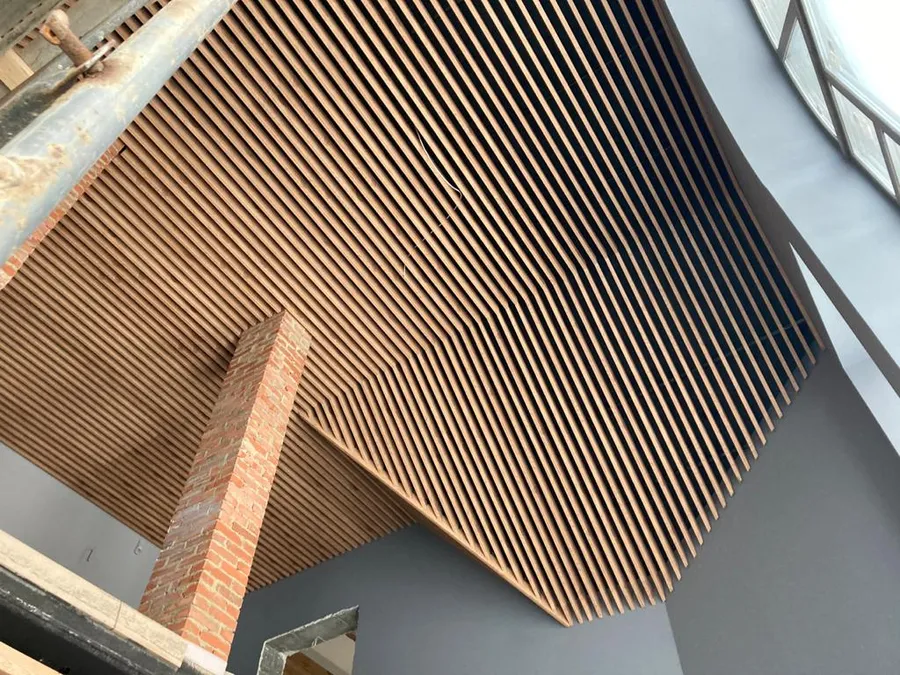 Кубообразные рейки изготавливаются из оцинкованной стали и алюминия и окрашиваются в любой из цветов RAL или имитирующий древесину по желанию заказчика